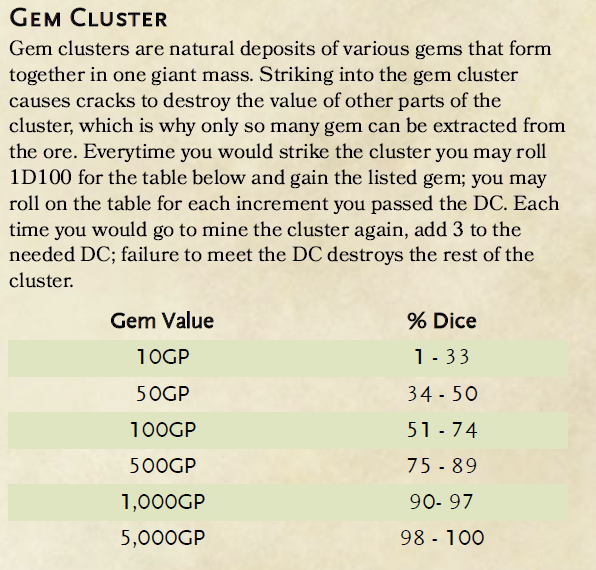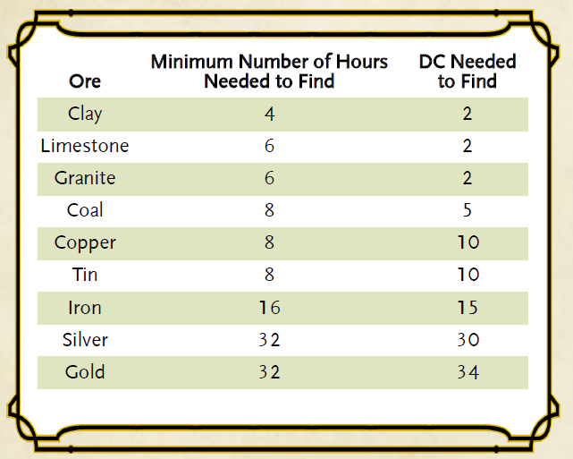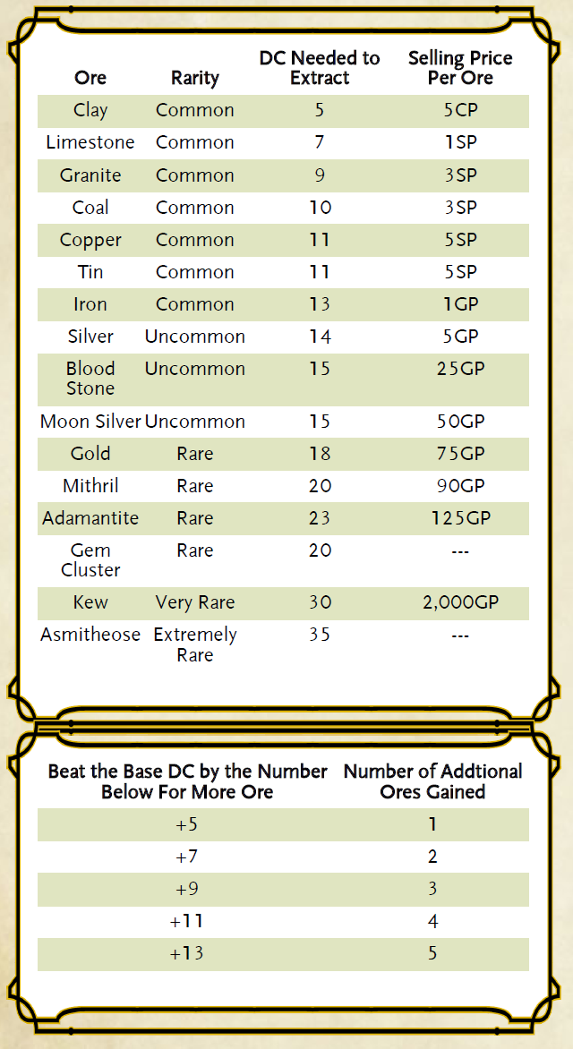 If you would match the base DC, you gain one chunk of that ore or rock type. If you beat the DC, determine by how much and compare it to the second table. You gain that many more ores. If you would roll, for instance, a ten plus eight for mining coal, you would receive three chunks of coal; one from rolling a ten and two from the additional ores table. Always round down to the closest category when determining how many chunks of ore you receive.